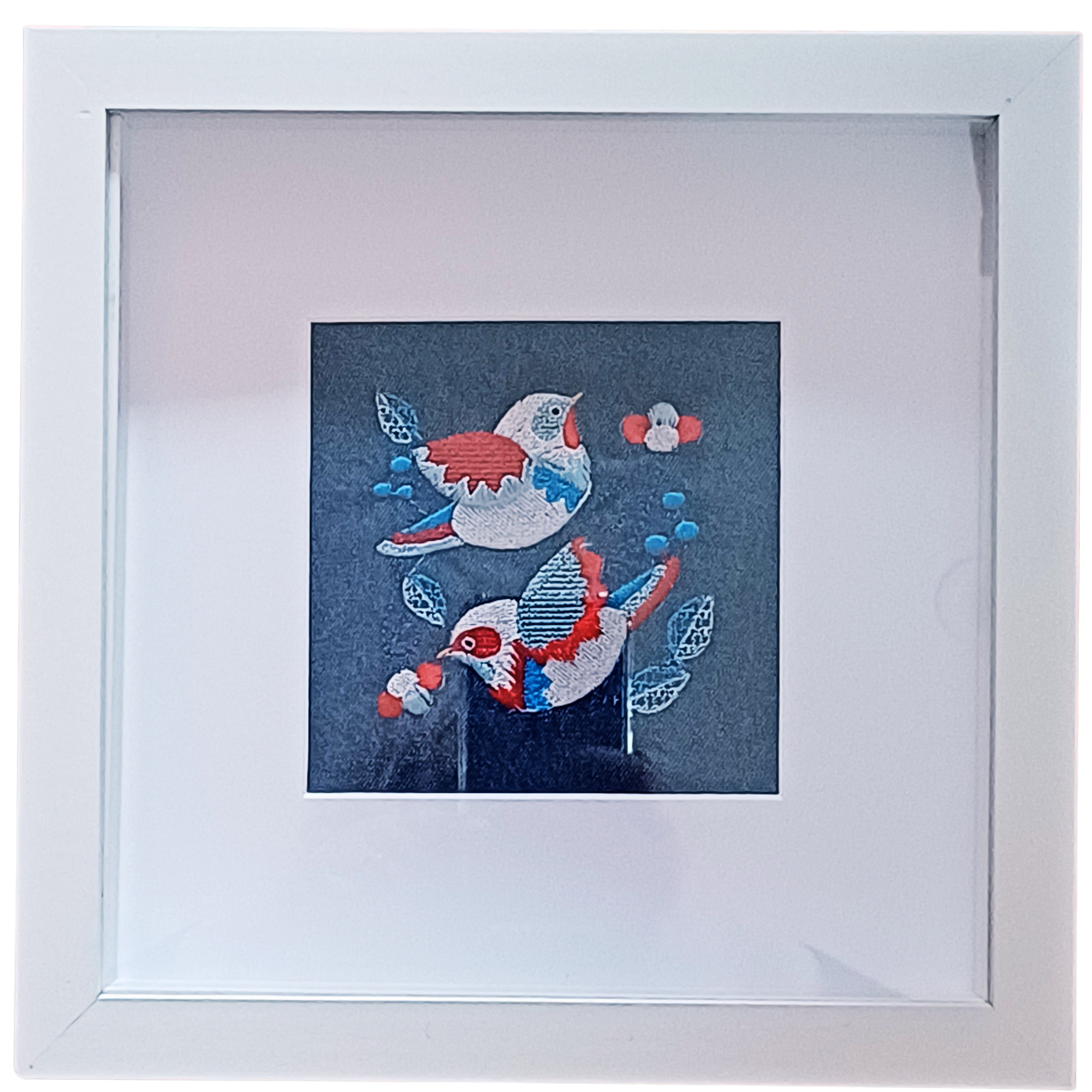 These beautiful birds are embroidered on a piece of high quality recycled denim fabric Framed in a white box frame which can be hung on a wall or placed on a shelf.