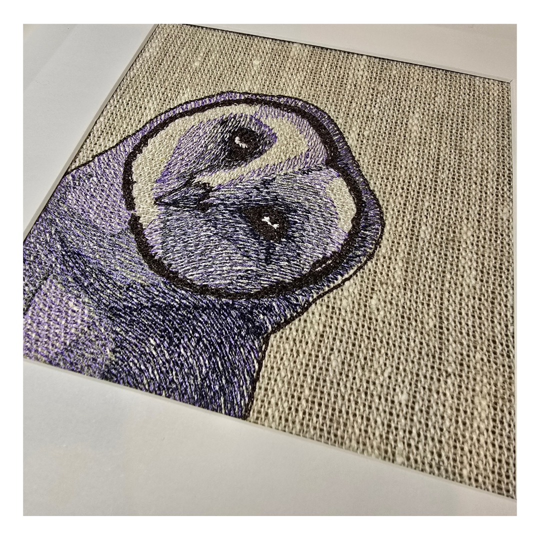 This striking owl is embroidered on a piece of high quality linen fabric Framed in a white box frame which can be hung on a wall or placed on a shelf.