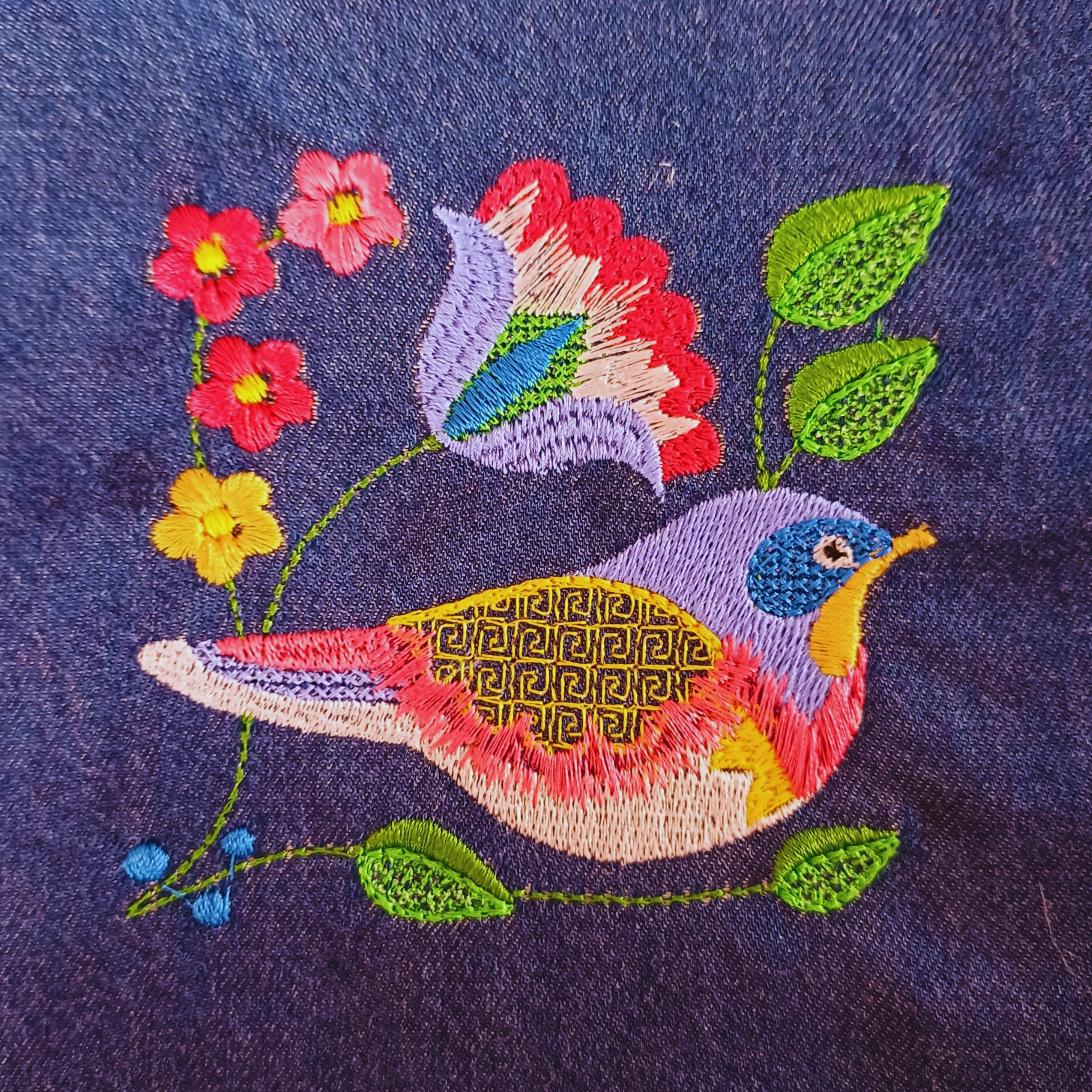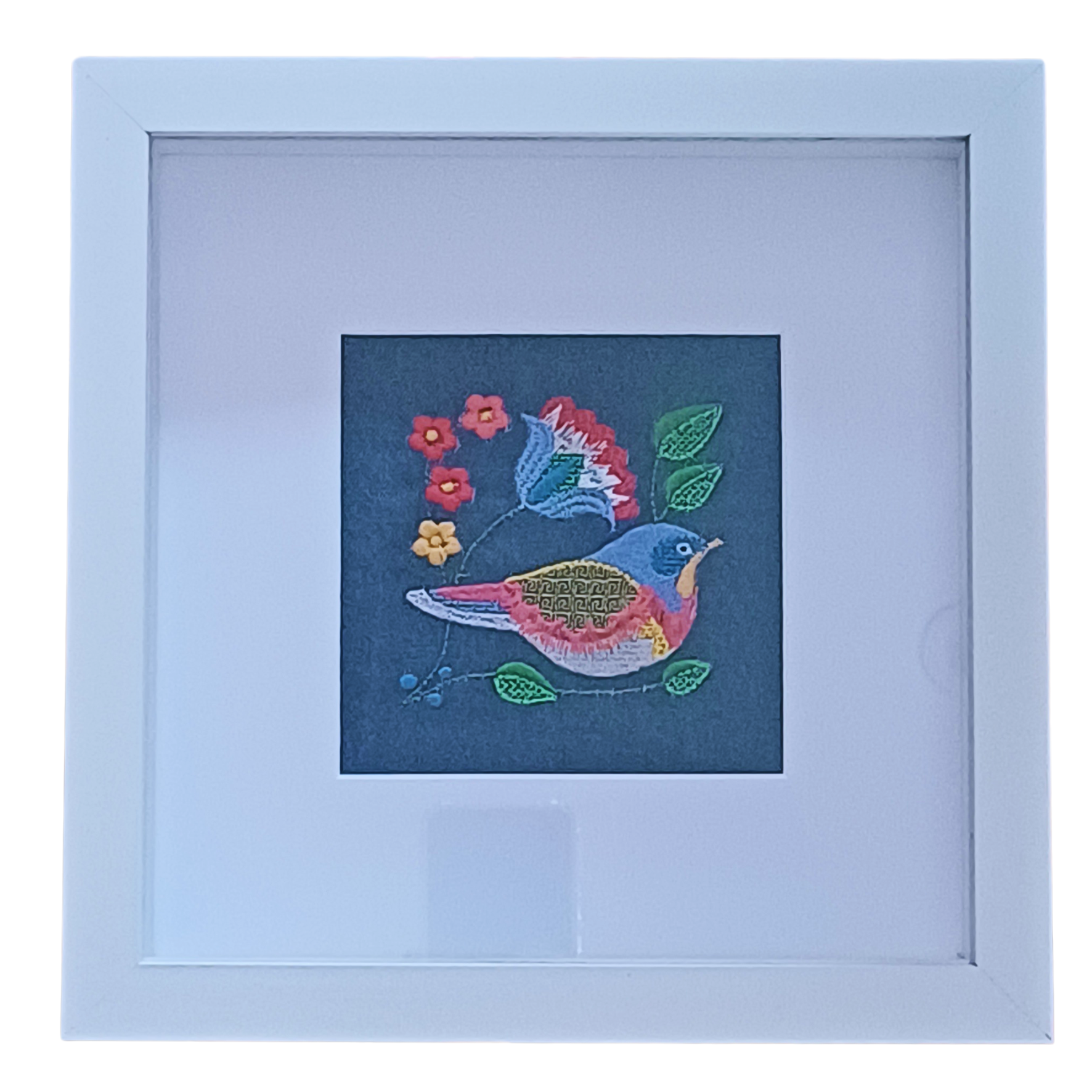 This gorgeous bird and floral design is embroidered on a piece of high quality recycled denim fabric Framed in a white box frame which can be hung on a wall or placed on a shelf.